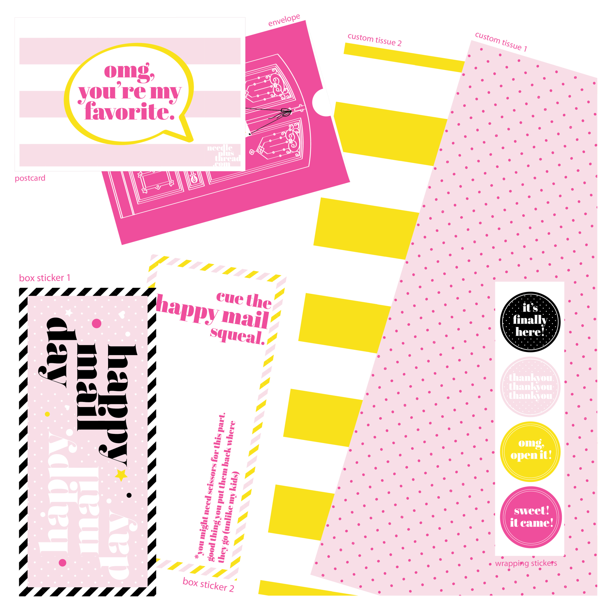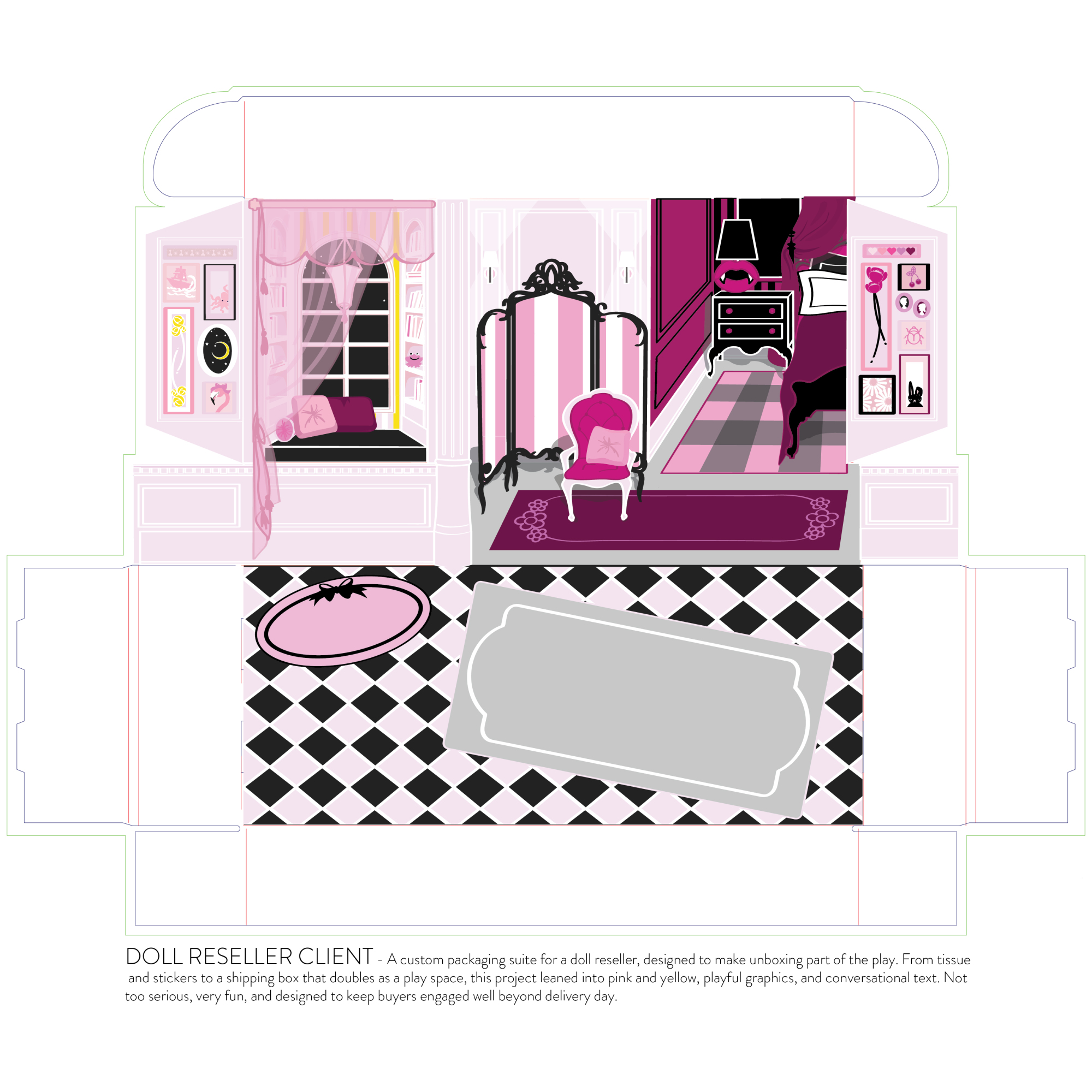 A custom packaging suite for a doll reseller, designed to make unboxing part of the play. From tissue and stickers to a shipping box that doubles as a play space, this project leaned into pink and yellow, playful graphics, and conversational text. Not too serious, very fun, and designed to keep buyers engaged well beyond delivery day.